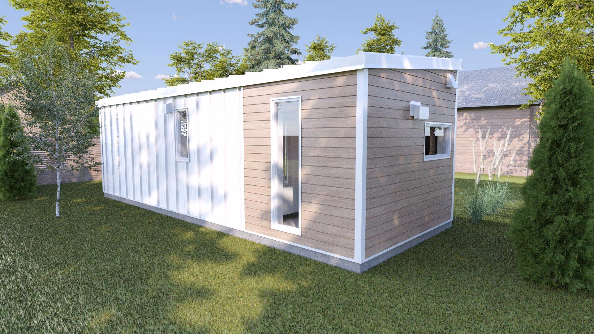 The exterior style of the Mini 30 is contemporary. The clean and homogeneous design has been thought so that it can blend in well with any backyard. The suggested cladding is a mix of standing seam steel with hidden fasteners installed vertically with woodgrain imitation steel installed horizontally. The vertical steel is offered in three colors: black, white and charcoal gray while the horizontal steel is offered in three colors; espresso, desert and urban gray. The exterior trims are 26G steel matched to the horizontal cladding and the doors/windows are in aluminum, all black in color, except when the vertical steel is white in color. The openings are maximized on the front elevation, but there are still windows on all sides to let in a maximum of natural light. The vertical windows also create an interesting visual connection with the outdoors.
