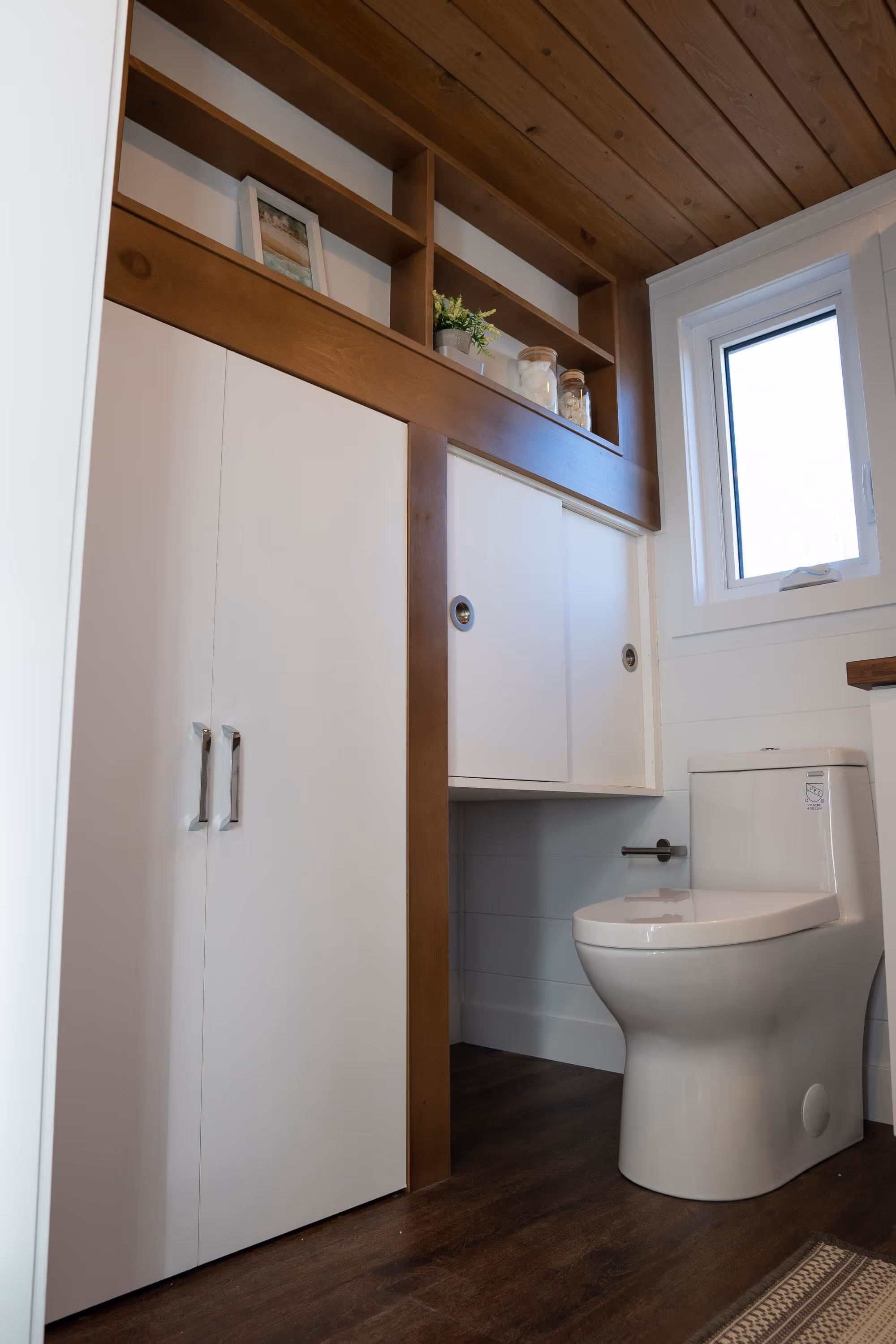 The Charme is distinguished by its open space concept. There is a loft at both ends and a master bedroom next to the entrance, right under a loft that is accessible with a ladder stored in the kitchen. This one mostly serves for storage or extra sleeping space. The access to the other loft is accessed by a storage staircase landing on a platform with a clearance that allows one to change clothes while standing up in front of the closet. This model features a fully equipped kitchen and space for stackable washer and dryer along with a complete bathroom. In terms of materials, the Charme comes standard with white painted engineered siding on the walls and stained knotty pine for the ceiling.